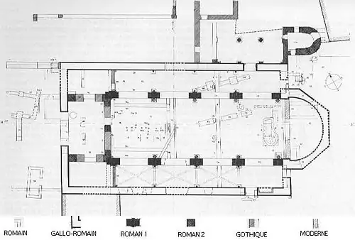Une troisième phase de fouilles, française (les deux campagnes précédentes ayant été faites sous administration allemande), par J.-J. Hatt, en 1959-1960 et C. Heitz en 1964 et enfin de R. Will en 1975, met au jour des parties plus anciennes et d’utilisation laïque, sous l’édifice et devant la façade occidentale : villa romaine, palestre, thermes. Il est alors proposé que ce fut une bâtisse ayant rôle d'aula palatina à l’image de celle de Trèves, sous Constantin en 310. H. Milius et R. Will émettent l’hypothèse que ce palais ne fut jamais terminé. L’utilisation du bâtiment reste floue jusqu’à des traces écrites d'Otton Ier du Saint-Empire et la création d’une abbaye bénédictine pour femmes dédiée à saint Pierre. Puis des traces écrites de travaux, bien courtes, sous Adalbéron II de Metz, font penser que la majeure partie des transformations seraient de cette époque. L’apparition d’une salle, peut-être capitulaire, mise au jour par R. Will en 1977, au nord, daterait de cette phase de remaniement.