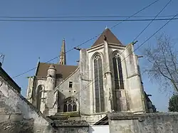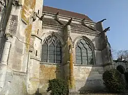 Sur le chevet, les fenêtres orientales des collatéraux arborent des réseaux flamboyants à trois formes, et l'abside se caractérise par cinq fenêtres à deux lancettes particulièrement élevées. Peu exposé aux regards, le décor de l'abside est déjà bien réduit par rapport à l'élévation méridionale, mais chacun des contreforts bénéficie quand même d'un pinacle et d'une gargouille en hauteur. Au nord, seulement les éléments purement fonctionnels ont été maintenus, et les murs ne sont pas appareillés en pierres de taille, mais bâtis en moellons irréguliers. Des gargouilles se trouvent uniquement sur le croisillon nord. Il est éclairé à son extrémité par une vaste et large baie à deux forts meneaux et par des baies étroites à l'ouest et à l'est. Une petite porte trouve place sous la fenêtre d'extrémité. Une troisième porte s'ouvre au centre de la façade occidentale. Flanquée de deux pilastres supportant un entablement, avec des médaillons dans les écoinçons, son décor affiche le style de la Renaissance. La nef n'est éclairée que par un oculus rond depuis l'ouest.