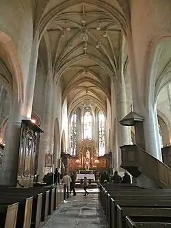 Encore davantage que l'extérieur, tout l'intérieur de l'église est stylistiquement homogène. L'ensemble du vaisseau central et du transept sont voûtés à la même hauteur. Ils se caractérisent par une belle ampleur et un certain élancement, rare pour les églises flamboyantes en milieu rural. La hauteur sous le sommet des voûtes correspond à deux fois la largeur entre les piliers. D'autre part, comme d'usage dans la région à la période flamboyante, les murs hauts de la nef sont aveugles, à l'exception d'un oculus dans le mur occidental, qui est muni d'un remplage inhabituel d'un losange formé par quatre quarts-de-cercle juxtaposés. L'éclairage par la lumière naturelle est donc presque exclusivement assuré indirectement par les bas-côtés, les croisillons du transept et l'abside. Grâce à l'emploi de pierres d'un teint claire, l'intérieur est toutefois assez lumineux, et la faible profondeur de la nef évite aussi une ambiance trop sombre, puisque les croisillons disposent de fenêtres hautes. Des lignes claires en lien avec des proportions harmonieuses rendent l'intérieur élégant en dépit de sa grande sobriété. L'absence totale de chapiteaux, le recours systématique à des piliers ondulés, et la mouluration savante de l'intrados des grandes arcades en arc brisé, soulignent cette impression[5],[6].