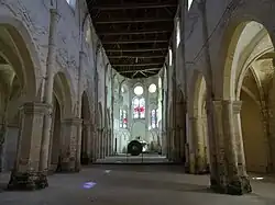 La nef composée de trois vaisseaux de quatre travées a été érigée à partir de 1550. Elle comporte une élévation à deux niveaux de grandes arcades en arcs brisés qui reposent sur des piliers et des colonnes adossées dotés de simples chapiteaux doriques. Le vaisseau central est couvert d'une charpente apparente, les bas-côtés sont voûtés sur croisées d'ogives ornées de clés de voûte. Une clé est sculptée d'un Agnus Dei, sur une autre sont représentées des clés, symboles de saint Pierre.