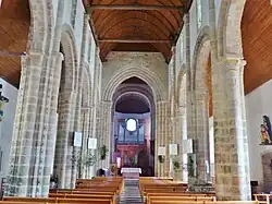 La nef de 5 travées s’ouvre sur les bas-côtés étroits, éclairés de larges fenêtres modernes, par des arcades de plein cintre à double archivolte, légèrement outrepassées[3]. Elles sont soutenues par des piles composites : colonne flanquée de quatre colonnettes engagées en alternance avec des piliers à double ressaut et colonnette engagée ou des colonnes flanquée de colonnettes jumelées[2]. Les grandes arcades occupent deux tiers de la hauteur du mur, laissant peu d’espace pour les fenêtres hautes de plein cintre[3] qui se réduisent à l’extérieur à d’étroites meurtrières. Chaque travée est nettement marquée par une colonne engagée (parfois doublée) partant du sol jusqu’au sommet de la paroi[3], dispositif qui rappelle les églises de Langonnet, Perros-Guirec et Yvignac[2].