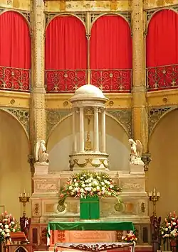 Commandé au marbrier Bellami à Carrare le maître autel date de 1872. A gradins, il est composé de blocs de marbre polychrome. La table d'autel est ornée d'un bas-relief représentant la Cène. Le tabernacle est situé dans la partie médiane et est encadré de têtes d'angelots. Au-dessus de la table se trouve un édicule de temple circulaire qui protège la croix d'autel. Le dôme est soutenu par six colonnes qui repose sur un socle arrondi décoré d'une frise d'angelots qui retiennent des guirlandes de fleurs. Deux anges adorateurs en marbre encadrent l'ensemble[10].
