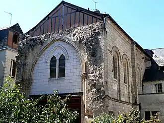 Après les destructions qui suivent la Révolution française, une partie de la première travée et la seconde travée dans son intégralité du collatéral nord subsistent. Des murs, construits à l'est et au sud et prenant appui sur les arcades de la deuxième travée, transforment l'espace en habitation dont le volume est divisé en deux étages par un plancher. Une salle conserve cependant sa voûte de type gothique de l'Ouest[23]. Le mur septentrional de la seconde travée est percé de deux baies en plein cintre décorées d'un cordon se prolongeant de part et d'autre — cette baie est d'origine, celles éclairant l'est et le sud sont modernes. Une baie identique existe sur la partie conservée de la première travée.