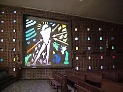 Une immense fresque de 200 m2 représentant le Christ embrassant le monde a été réalisée par Geneviève d'Andréis.