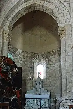 Il ne reste plus de l'église romane que l'absidiole nord et quelques portions de l'arc triomphal de l'abside de la nef centrale.