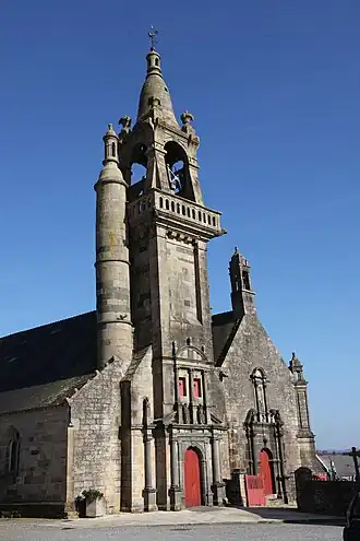 La flèche, plus jeune (1850) car rebâtie après avoir été abattue par la foudre dans la nuit du 13 au selon le chanoine Abgrall, fut réalisée suivant les plans de l’abbé Pouliquen, vicaire de la paroisse. Elle a curieusement la forme d’une cloche. Le clocher est accosté de chaque côté par deux hautes et élégantes tourelles identiques. Au sud-ouest un ossuaire daté de 1692 porte un clocheton.