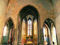 Pour certains historiens, les travaux ne se seraient achevés qu'un siècle plus tard avec, entre-temps, un changement de style avec la nef unique. Cependant, on note des traces de modifications montrant une histoire de la construction de la nef plus complexe. Certaines parties de la nef sont anciennes, probablement, antérieures au XIVe siècle. Il semble que les colonnes d'appui ont été placées dans des maçonneries plus anciennes et leurs bases ne sont pas postérieures à 1400 et peuvent remonter à l'époque de la construction des colonnettes du chevet. La comparaison des murs nord et sud montrent des différences sensibles. Des ouvertures, aujourd'hui aveugles, du mur nord rappellent celles faites dans la petite chapelle placée contre le bras nord du transept et la première travée de la nef. Ce mur nord de la première travée est oblique. Ce qui peut laisser à penser qu'il a fallu raccorder les parties orientales de l'église à des murs déjà existants de la nef. Les parties hautes du mur nord ont dû être refaites quand les voûtes actuelles ont été réalisées.