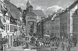État de l'église dans le cadre urbain vers 1750 ; L'église se trouve à peu près au milieu supérieur de l'image (modèle de la ville au musée de la Marche de Brandebourg)