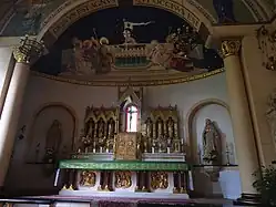 Les voûtes de la nef à quatre travées et la décoration des murs sont d'inspiration Renaissance, dans le style de Ralf Lürig. La tribune qui se trouve au-dessus du portail comporte un orgue. On remarque devant l'abside un arc en baldaquin soutenu de colonnes. Le mur d'abside est peint d'une fresque de l'agneau de l'Apocalypse avec l'inscription ''Dignus est Agnus qui occisus est [accipere virtutem, et divinitatem, et sapientiam, et fortitudinem, et honorem] (Apocalypse de saint Jean, 5, 12).