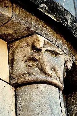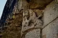 - 10 Un couple nu enlacé : Ce modillon est partiellement érodé, mais il existe des dizaines, quasi identiques, dans des églises romanes de la Gironde, la Charente et la Charente-Maritme et en Espagne, voir par exemple Iconographie des modillons romans - les couples. Du fait que l'érosion est différent pour chaque modillon on peut établir la composition originelle. Il s'agit d'un homme et une femme nus en traîne de copuler.