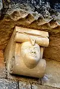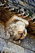 - 3 Le seul modillon non-figuré porte un décor de feuilles et de lianes qui forment une pyramide, comme le classique 'point de diamant'.