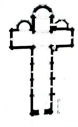 - Le plan, en forme de croix latine, comporte une nef de quatre travées. La nef est plafonnée en berceau brisé ; ses quatre travées sont séparées par de longues colonnes aux bases ornées de griffes. Leurs chapiteaux un peu courts n'ont reçu qu'une très simple garniture de feuillage.