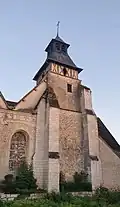 Au XVe siècle, la nef fut agrandie en direction de l'est et pratiquement doublée de taille. Le clocher datant du XVIe siècle est une tour carrée de même construction que l'église avec une partie haute en pans de bois. Il s'élève à peu près au milieu de la grande nef, couvert en ardoises en 1933, il se termine par une croix en fer culminant à 23 mètres du sol.