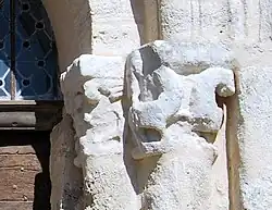 Il y a quelques remplois au nord du portail : un pierre tombale ornée d'une croix dans le contrefort nord et, près du coin nord du fronton, une niche contenant une femme nue, assise, les jambes écartées, qui indique son sexe de sa main gauche.