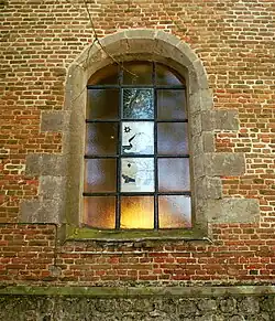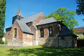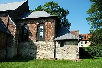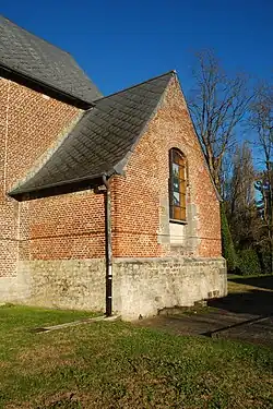 La maçonnerie du chevet est constituée sur une hauteur d'environ deux mètres d'un mélange de moellons de grès et de grès ferrugineux, la partie haute de la façade étant édifiée en briques rouges et percée de fenêtres à arc surbaissé.