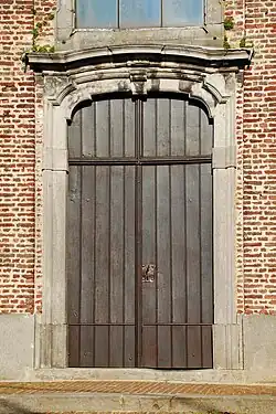 Cette façade est percée d'un portail en pierre bleue aux piédroits moulurés et harpés supportant un linteau chantourné à clé saillante, surmonté d'un puissant larmier.