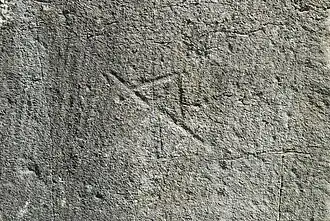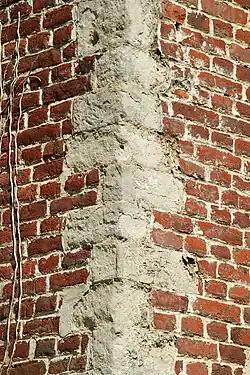 Le soubassement du croisillon, réalisé en moellons de grès[3], présente à un des angles un chaînage en pierre bleue dont certains blocs portent une marque de tâcheron.