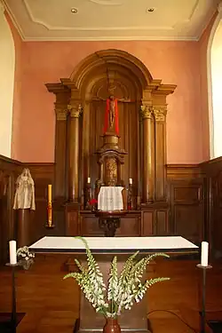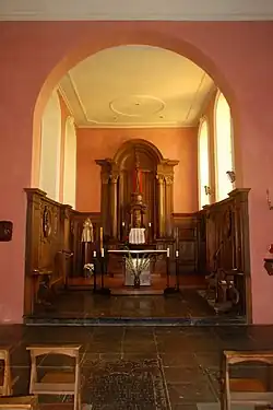 Le chœur contient un bel autel en bois, daté des environs de 1760[2], flanqué de colonnes et de pilastres en bois aux chapiteaux dorés supportant un arc cintré.