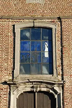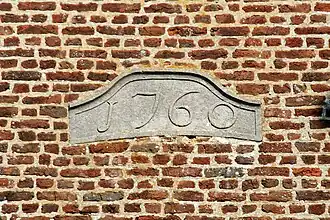 Le sommet de la façade est constitué, comme dit plus haut, d'un fronton triangulaire agrémenté d'un cartouche arborant le millésime « 1760 »[3].