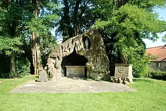 Dans l'enceinte de l'ancien cimetière, face au chevet, se dresse une réplique de la grotte de Lourdes construite en 1932 par Gustave Francotte[3].