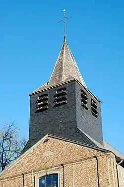 Dominant la façade, un clocher ardoisé de plan carré percé sur chaque face de deux baies campanaires à abat-sons supporte une flèche octogonale également couverte d'ardoises[3].
