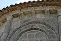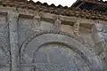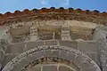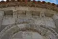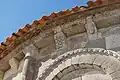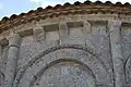 L'abside, voûtée en cul-de-four, est éclairée par trois fenêtres étroites. Elle possède à l'extérieur sept arcades cintrées, dont les voussures retombent sur des pilastres décorés en dents de scie, de dents-de-perles, de dents-de-loup, de damiers (en) et de perles. La corniche repose sur des modillons.