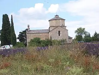 Le plan cruciforme de l’église, avec transept bien marqué et trois absides basses percées de petites baies cintrées dépourvues de décor, se révèle avec netteté lorsque l’on aborde le monument par l’est. Seule la partie inférieure des murs, construite en petit appareil régulier de calcaire blanc, est romane ; les parements des parties hautes, faits de moellons irréguliers, sont des reprises modernes. Extérieurement, la croisée du transept se manifeste par un massif carré bien appareillé, ajouré côté est d’une petite fenêtre romane sous un arc de décharge pris dans la maçonnerie. Au-dessus s’élève un tambour octogonal surmonté de l’amorce d’un lanternon qui est une restitution récente. Cet ensemble abrite une coupole sur trompes encore intacte, édifiée sur le modèle de celle de Bourg-Saint-Andéol.