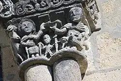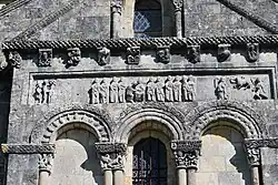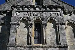 - un bandeau sert d'appui à trois arcades portées par des colonnes sculptées avec la sculpture en relief d'un musicien étrangement plaqué à mi-hauteur sur deux colonnes géminées.
