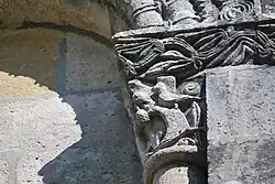 La corniche commune aux trois chapiteaux et le tailloir torsadé du chapiteau central ne sont pas d'origine, ils ont été refaits au XIXe siècle.