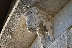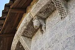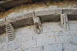 Les modillons sous la corniche sont assez rustiques : têtes de loup ou de monstre et dessins géométriques. On ne voit pas de leçon de moralité, comme à l'accoutumée.