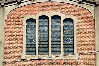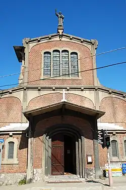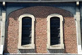 La façade comporte deux registres. Le registre inférieur est tripartite : sa partie centrale est composée d'un panneau de briques rouges surmonté d'un large arc en anse de panier en béton tandis que les deux parties latérales (correspondant aux collatéraux) sont sommées chacune d'un arc rampant.