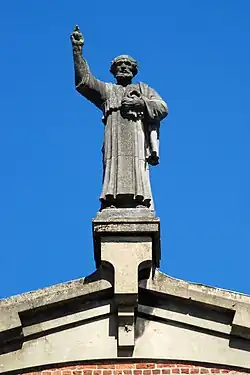 Le registre supérieur, pour sa part, est composé d'un panneau de briques percé d'un groupe de quatre baies de hauteurs variables. Ce panneau de briques est flanqué de pilastres en béton aux angles chanfreinés sur une partie de leur hauteur, supportant un large arc en anse de panier en béton surmonté par une statue de saint Pierre bénissant.