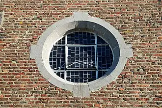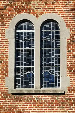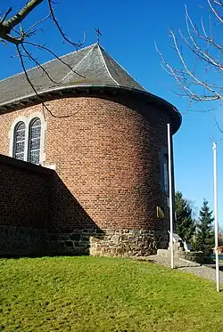 À l'ouest, l'église présente une tour flanquée d'annexes carrées[1]. Tant la tour que ses annexes sont cantonnées de chaînages d'angle faits de grands blocs de pierre bleue[2].