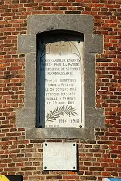 Deux plaques commémoratives sont apposées au pied du chevet pour perpétuer le souvenir des combattants du 110e régiment d'infanterie et de la 1re division marocaine tombés durant la bataille de Gembloux lors des combats autour d'Ernage les 14 et :