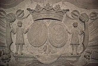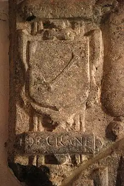La pierre, fragmentée et incomplète, représente un aristocrate et son épouse, flanqués de quartiers d'armoiries dont l'un se lit encore très clairement « De Crane ».
