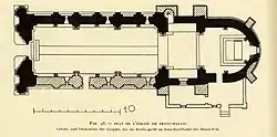 Un ensemble aussi franchement structuré semble annoncer une nef flanquée de collatéraux, en fait il précède une nef unique, le mur du pignon déborde largement de part et d'autre des murs gouttereaux, nous touchons ici à l'artifice.