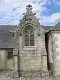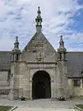 Le portail occidental, qui porte la date “1616”, est surmonté de trois clochetons à dôme. Au fronton, une niche abrite une statue de saint Pierre[3]. La baie Sud-Ouest est de la même époque et rappelle l’ornementation du château de Kerjean. Le clocher, élevé de 1582 à 1584 par Jean Le Taillander, auteur de celui de Ploubezre et de l’arc triomphal de Saint-Jean-du-Doigt[2]. Il est sommé d’une flèche octogonale qui culmine à 45 mètres de haut, entourée d’un balustre, de clochetons d’angle[3] et d'une tourelle d'escalier octogonale au coin sud-est[4].