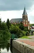 L'édifice de pierre et brique a été construit selon un plan basilical traditionnel avec une nef à bas-côtés et un chœur. La façade est percée de trois portails surmontés chacun d'une rosace. Au-dessus du portail principal, le clocher domine avec son toit en ardoises. L'église est voûtée d'ogives mais les fenêtres sont en plein-cintre.