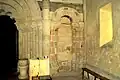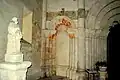 Le portail ancien est enfermé dans un porche moderne. Il se compose d'une porte centrale flanquée de deux fausses portes. La porte centrale, à redents, présente des chapiteaux jumelés et des tailloirs. La partie haute de la façade a été refaite à l'époque moderne.