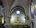 L'architecture atypique de cette église s'explique par des influences stylistiques différentes, passant du baroque et du classique au néo-gothique. Formant une croix latine, l'église est composée d'une nef divisée en trois travées, couvertes de voûtes ogivales (en dehors de la première travée, couverte d'une voûte lambrissée) reposant sur des colonnes portant des chapiteaux corinthiens ou sur des piles rectangulaires, d'un transept saillant et d'une abside rectangulaire en moyen appareil. De même que la croisée, l'abside est couverte d'une charpente évoquant un navire renversé. Le mur du chevet est aveugle et orné d'un christ crucifié d'inspiration baroque.