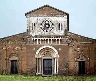 La façade, en avant du corps central, présente comme éléments principaux le portail, la rosace entourée d'une multitude d'éléments décoratifs et les entrées latérales. Le portail, encastré dans le mur de nenfro, est l'œuvre d'un artisan romain de l'école cosmatesque. Il se caractérise par des colonnes lisses, des chapiteaux et des archivoltes, avec des mosaïques latérales et des bossages ornés de signes du Zodiaque et de travaux saisonniers.