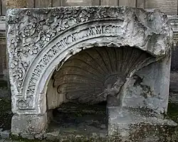 L’une des plus exceptionnelles trouvailles sur le site est constituée par les pièces principales des niches. Ces plaques de marbre massives consistent en un segment concave contenant au centre un paon vu de face, la queue déployée. L’épigramme se déploie le long du demi-cercle des motifs sculptés. Sur les tympans entourant les paons on retrouve des feuilles de vigne et leurs grappes[21]. Les lettres de l’inscription ont un relief de 11 cm et sont entourées de grappes de vigne au réalisme frappant. Les détails de chaque feuille sont reproduits avec une exactitude minutieuse. On voit les veines de chacune, les bords de quelques feuilles sont fanés et déchiquetés; l’artiste s’est même donné la peine d’augmenter l’impression de relief en penchant certaines vers l’avant alors que d’autres se replient vers l’arrière[22]. Martin Harrison fait remarquer que ce travail d’artisanat est dû à l’œil de l’artiste et n’utilise pas de modèle constant comme on peut le constater par différentes marques faites par le ciseau, d’infimes irrégularités et de toutes petites courbes dans le treillis. Cette décoration était originellement peinte de couleurs vives, les couleurs les plus utilisées étant le bleu, le vert et à moindre degré, le pourpre. Ces couleurs étaient rares ou difficiles à produire et montrent le pouvoir que pouvait exercer Anicia Juliana. L’arrière-plan des vignes et des lettres était en bleu vif. Les paons, associés à la déesse Héra et à la royauté dans l’Antiquité puis symboles de renouveau et de renaissance dans le christianisme primitif [23], décorés de colliers gravés, étaient peints en bleu, vert et or. Dans les cavités sculptées pour les yeux, on utilisait des pièces de verre de couleur verte[24]. Ces derniers tenaient dans leur bec des chaines auxquelles diverses choses devaient être suspendues. Selon Connor, leur location indiquerait la présence de lampes[23].