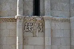 La partie orientale et la zone absidiale de l'église sont décorées majoritairement avec des palmettes, dents de scie, fruits, feuillages, pignes, etc. Cependant, il y a deux chapiteaux historiés qui représentent trois des sept péchés capitaux: Avarita, Luxuria et Libido. La décoration du chevet comporte deux étages distincts de colonnes et de pilastres, qui, pour le premier étage, ont un cordon d'entrelacs qui fait le tour de l'abside. Des sujets animés ont été sculptés dans ce bandeau, aux angles et sur les bagues contournant les fûts. Toutes ces sculptures font référence aux péchés capitaux.