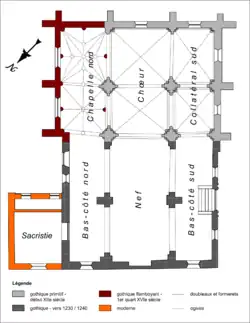 Il n'y a plus de fenêtres hautes, mais le mur occidental est percé d'une vaste baie en plein cintre au-dessus de la tribune. Côté est, l'arc triomphal en tiers-point contraste avec le profil en plein cintre du berceau de la nef. Elle repose sur les chapiteaux de crochets de deux colonnes engagées, flanquées chacune de deux colonnettes dont l'une supporte le doubleau secondaire, et dont l'autre, sans emploi, devait recevoir une ogive de la nef définitive, jamais réalisée[5],[6].