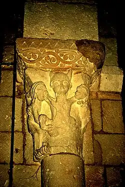 Sur chaque face du chapiteau, se trouve un « dragon ailé ». Celui de la face ouest a été martelé, il ne reste que sa silhouette. Par contre, les deux autres dragons sont complets. Celui de la face principale a la tête et la crinière d'un cheval, des écailles de poisson, la queue d'un serpent et des ailes. La créature sur la face orientale est très semblable, mais, avec sa langue fourchue, il lèche son aile. Il est accroché à l'astragale avec un pied griffu. Les trois dragons semblent plutôt jouer ensemble que combattre.