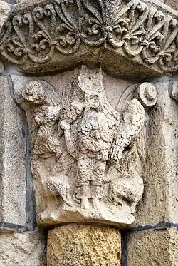 Au mur sud, se trouve une corbeille sans tailloir et très abîmée où on voit un petit homme barbu qui porte un bliaud serré par une ceinture nouée. Deux bêtes félines ont leurs têtes tournées vers lui. Le bras droite de l'homme a disparu, mais son bras gauche va sur la langue de la bête. Ce détail suffit pour affirmer que la représentation n'est pas celle de « Daniel dans la fosse aux lions », car selon le récit biblique « l'ange ferma les gueules » et « les lions ne l'avaient point touché ». Par contre, les corbeilles ou modillons où un pécheur enfonce ses mains dans la gueule d'une bête démoniaque étaient très fréquentes comme, par exemple, sur le cordon du sanctuaire de l'église de Saint-Quentin-de-Baron ou sous la corniche de l'église de Saint-Caprais-de-Bordeaux où se trouve également un authentique Daniel inter leones).