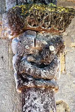 Les modillons de la corniche sont tous « géométriques » sauf pour deux exhibitionnistes masculins. Le premier était certainement, à l'origine, un homme ithyphallique, que la fragilité de la pierre ou le coup de marteau d'un iconoclaste du XIXe siècle a émasculé. Le deuxième est un exhibitionniste anal, « classique » dans les églises romanes[5],[6].