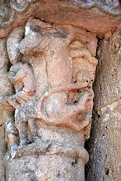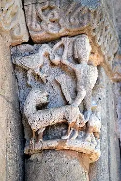 Deux quadrupèdes, aux cous distendus et enchevêtrés, s'étalent sur la quasi-totalité du chapiteau. L'un est un canidé, tirant la langue et sa queue sexuée fait un réseau complexe de nœuds et de torsades. L'autre animal a une tête simiesque. Un jeune moine tient la queue du monstre de ses deux mains et la soulève.