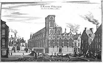 L'église Saint-Sauveur de Paris, gravure de 1656 dans Topographiae Galliae de Martin Zeiller, à l'angle de la rue Saint-Sauveur et de la rue Saint-Denis. L'entrée principale se trouvait alors à l'opposé.