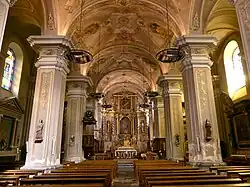 L'église est donc reconstruite au cours de la dernière partie du XVIIe siècle[1], entre 1675 et 1679[5]. Son financement est dû en partie aux confréries du Saint-Nom-de-Jésus (pour 4 500 florins) et du Rosaire (1 000 florins)[5].